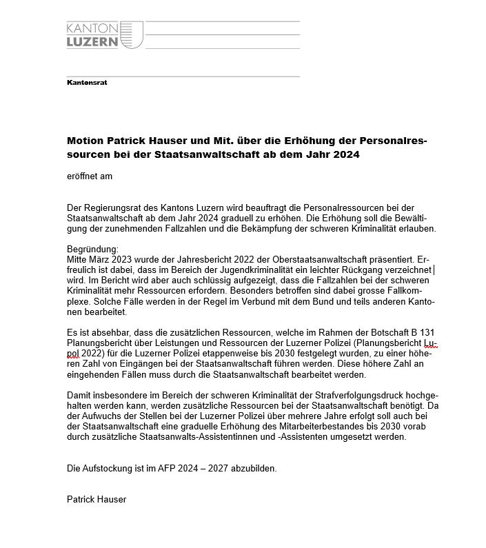 Am Montag, 19.6.2023 ist der Luzerner Kantonsrat in die neue Legislatur gestartet. Ich darf in dieser Legislatur die Kommission Justiz und Sicherheit (JSK) präsidieren. Zudem hat mich die Fraktion der FDP.Die Liberalen als Vize-Fraktionspräsident gewählt. Ich freue mich auf die neuen Aufgaben. Die Juni-Session dauert drei Tage und wird am 26. Juni abgeschlossen.